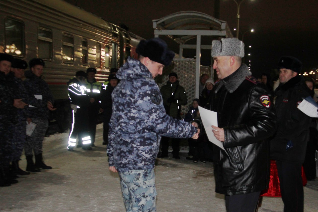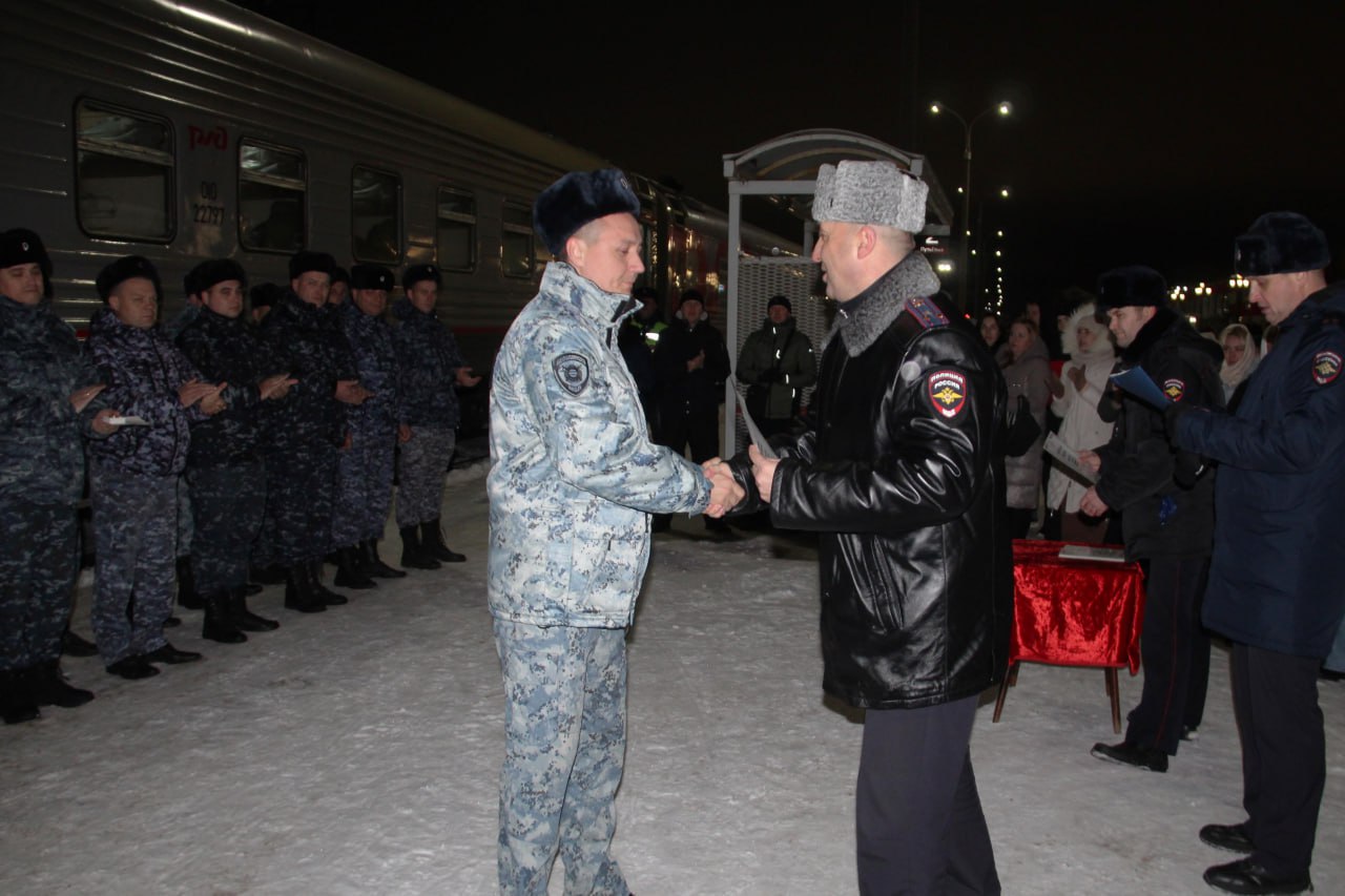 На перроне стражей правопорядка встретили руководители областного УМВД, сослуживцы, а также родные и близкие. Заместитель начальника Управления полковник полиции Александр Нечаев поздравил личный состав с возвращением домой, отметил успешное выполнение поставленных задач и высокие показатели в работе в период командировки, а также вручил ведомственные награды.