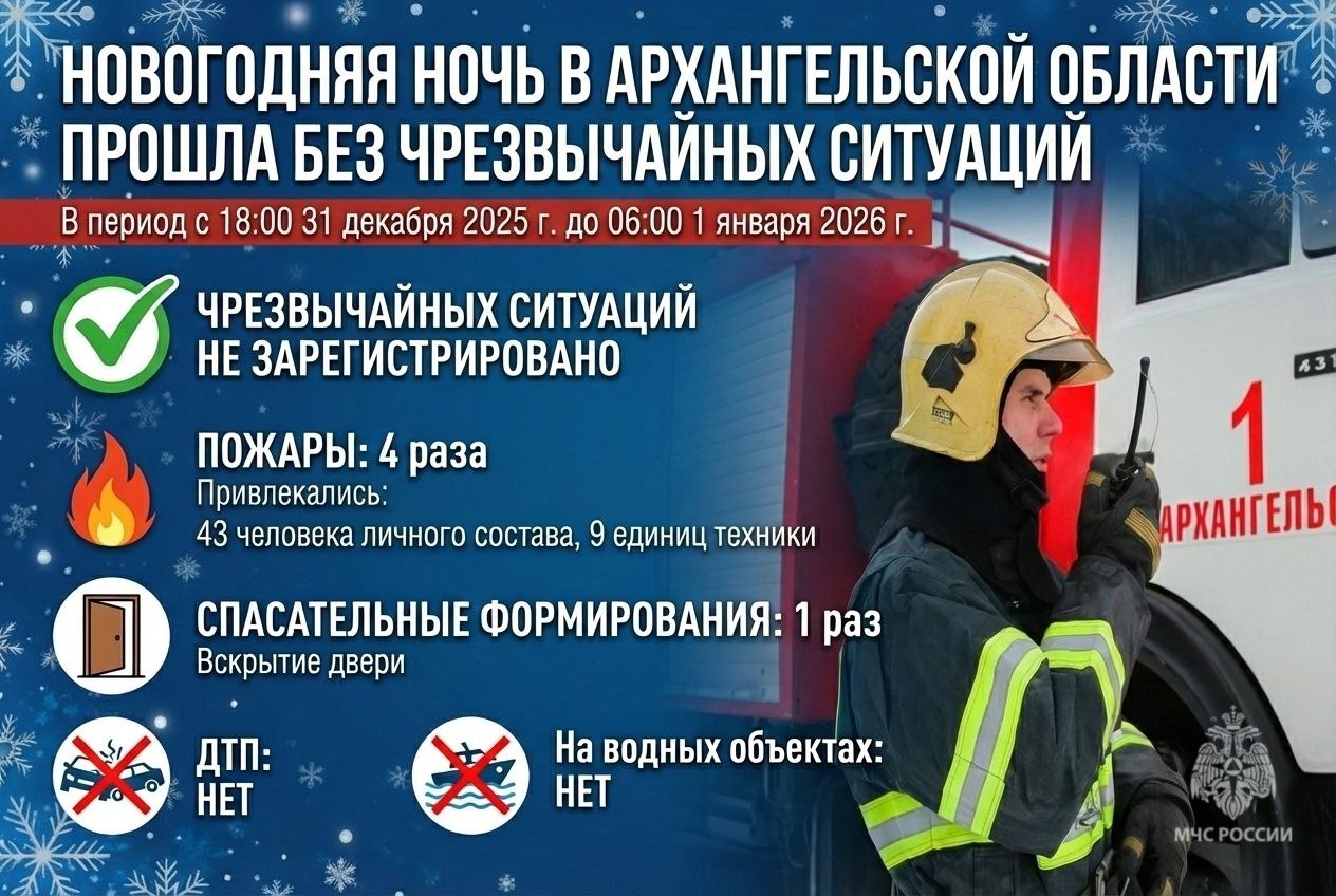 В период с 18:00 31 декабря 2025 года до 06:00 1 января 2026 года на территории Архангельской области чрезвычайных ситуаций не зарегистрировано.