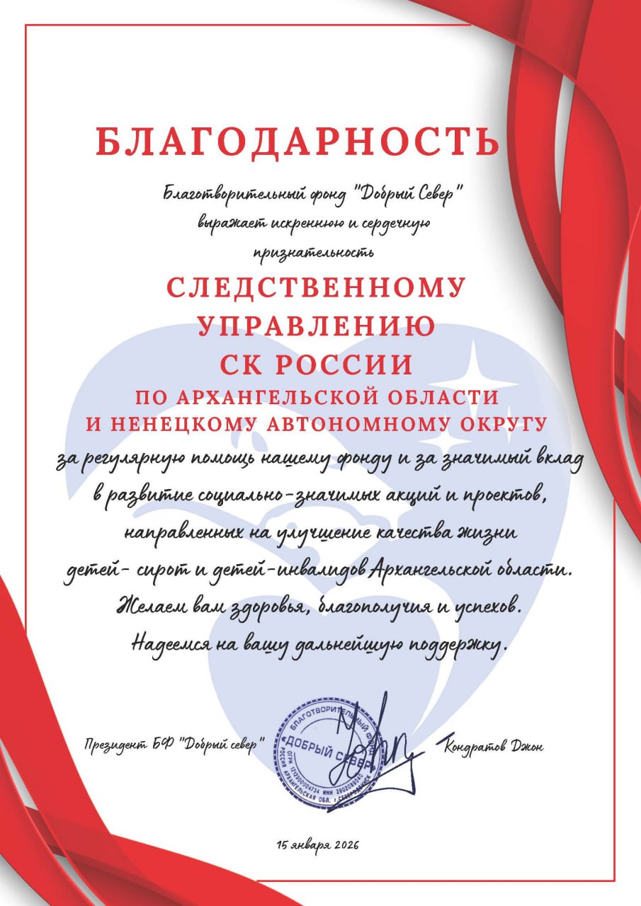Президент благотворительного фонда «Добрый Север» Джон Кондратов поздравил коллектив регионального следственного управления с 15-летнием образования Следственного комитета России, поблагодарил за многолетнее сотрудничество, неравнодушное отношение к проблемам граждан, вклад в развитие социально - значимых акций и проектов и пожелал успехов в службе.