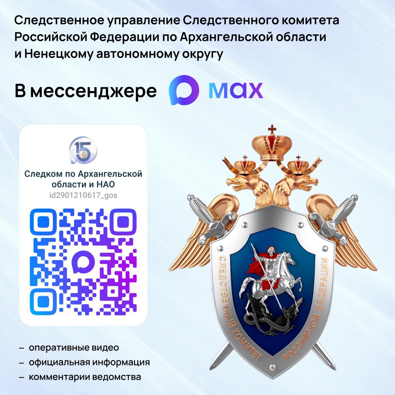 Следственное управление СК России по Архангельской области и Ненецкому автономному округу напоминает об официальном канале Следком по Архангельской области и НАО в национальном мессенджере MAX.