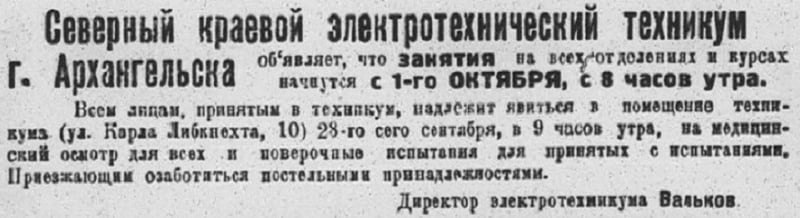 1 октября 1930 года впервые начались занятия в Северном краевом электротехническом техникуме. Сейчас это Архангельский колледж телекоммуникаций имени Бориса Львовича Розинга: здесь обучается свыше 1100 студентов по 9-ти направлениям подготовки. Коллектив принимает активное участие в спортивной жизни города, субботниках и патриотических мероприятиях. Молодцы!