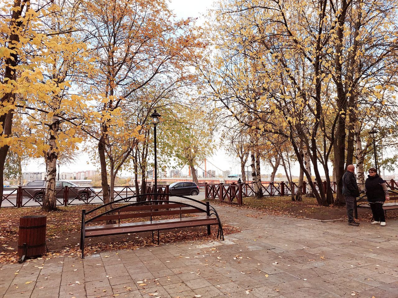 Если присесть к героям на причал, то открывается осенний вид на Кузнечевский мост.