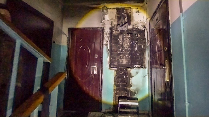 Пожарные в дыхательных аппаратах вошли в задымлённый подъезд и потушили возгорание с помощью порошкового огнетушителя и воды из пожарного рукава.