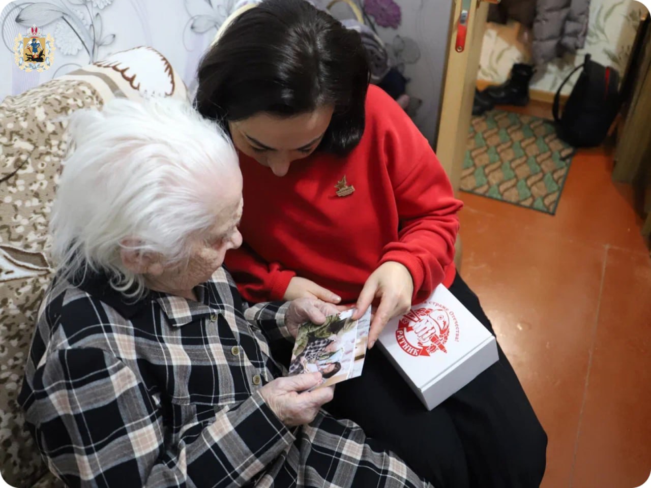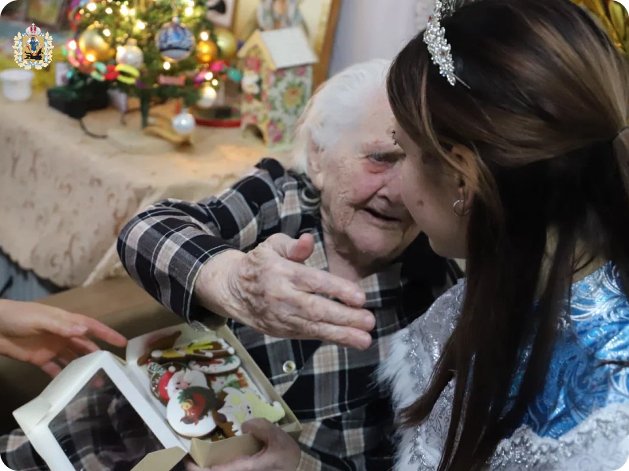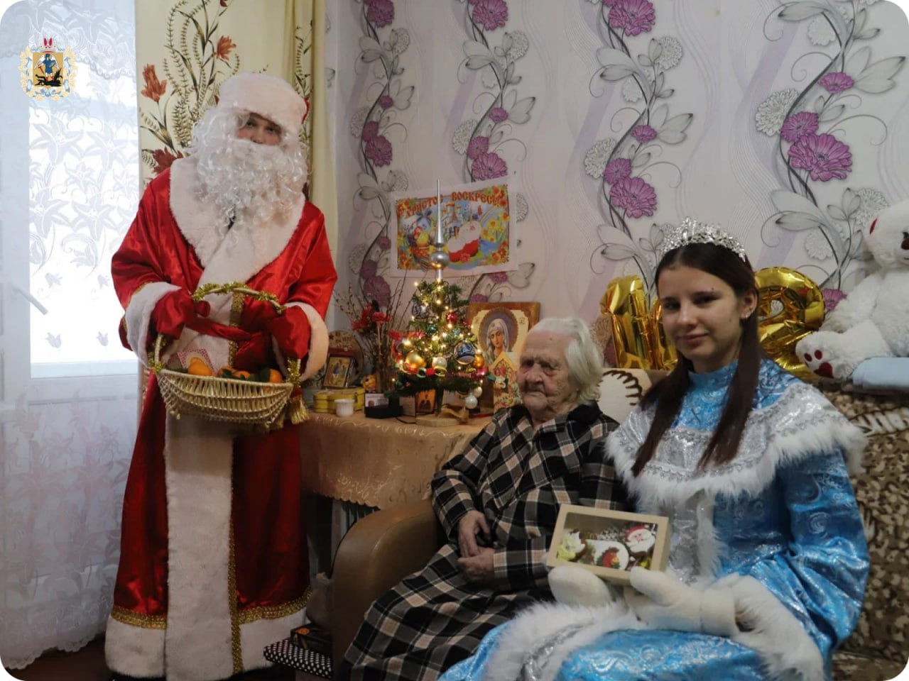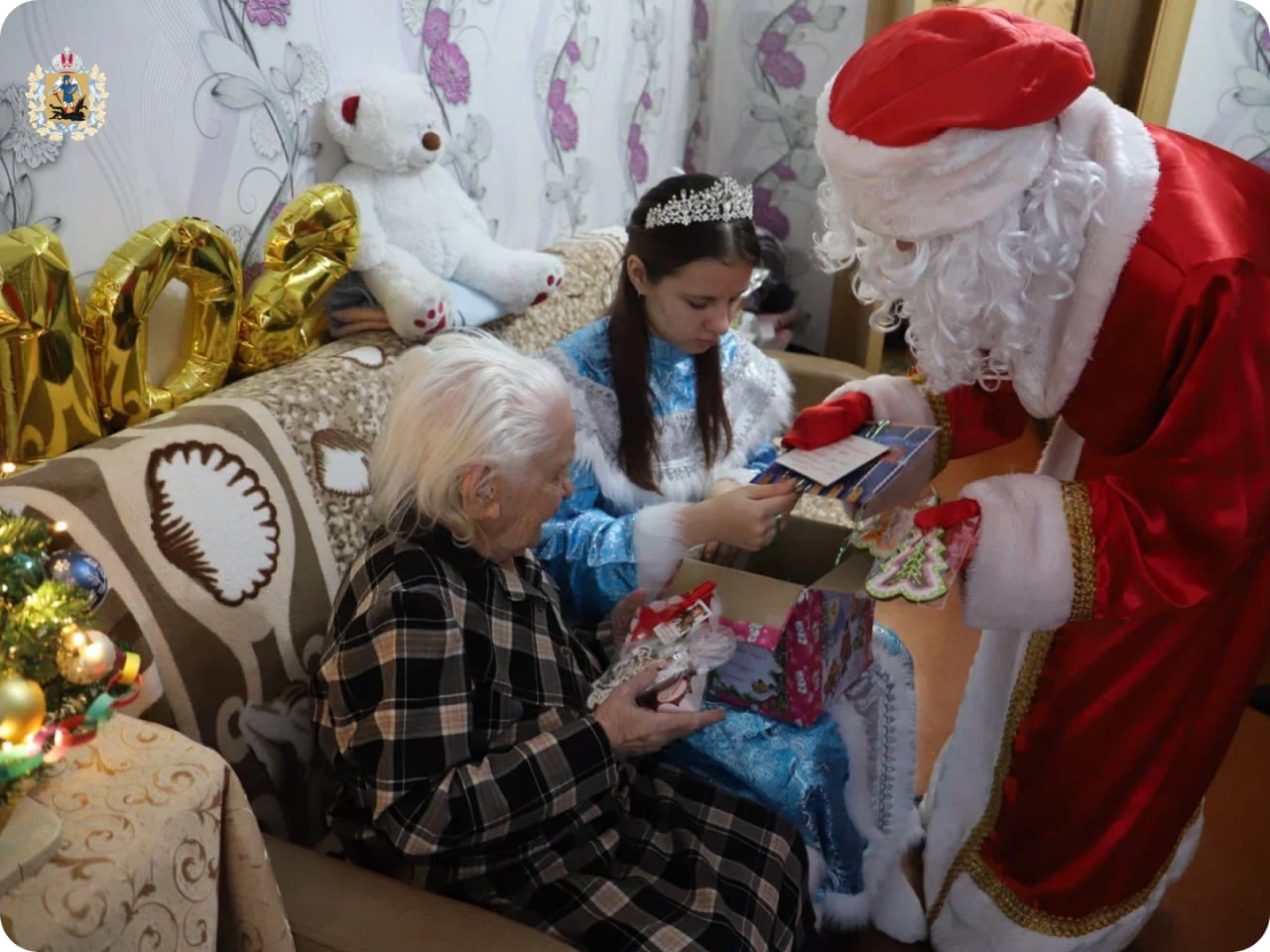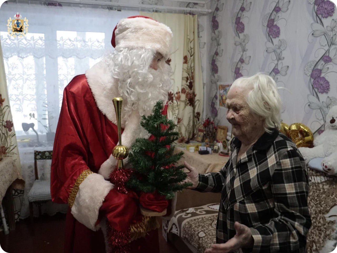 В роли Деда Мороза и Снегурочки выступили Захар и Милана из военно-патриотического клуба «Искорка» поселка Луковецкий Холмогорского округа. Вместе с Елизаветой Васильевной они нарядили елочку, обменялись подарками и уже наметили планы на предстоящий год.