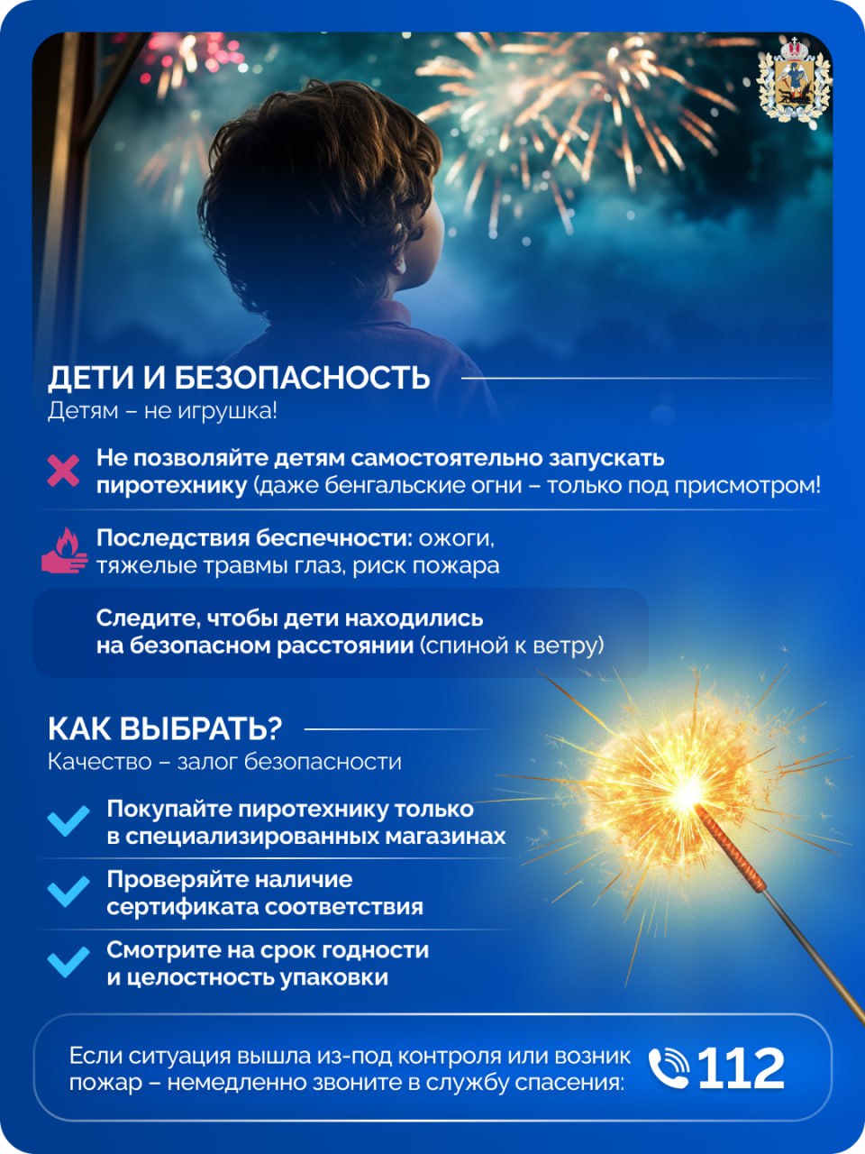 Дети не должны находиться рядом с местом запуска, передавать им пиротехнические изделия категорически запрещено.