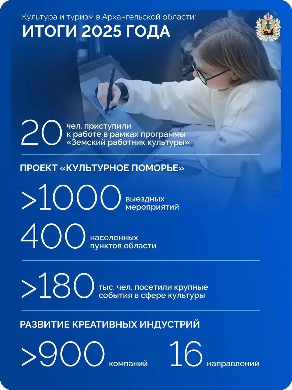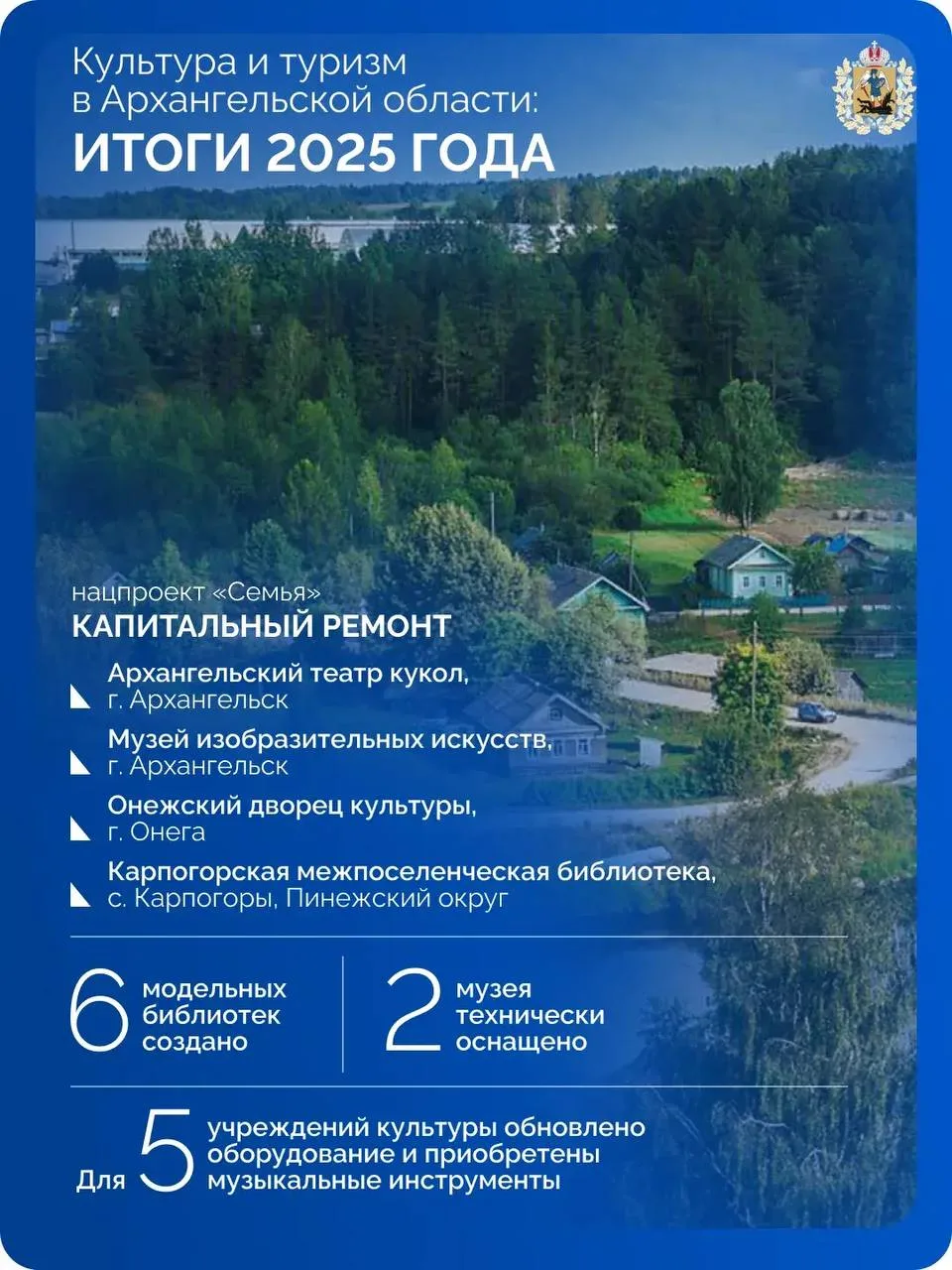 В 2025 году Архангельская область реализовала масштабные проекты в сфере культуры и туризма. Проведён капитальный ремонт ключевых объектов, создано 6 модельных библиотек, открыто новое креативное пространство «10-й цех». В рамках программы «Земский работник культуры» в сельские учреждения пришли 20 новых специалистов.