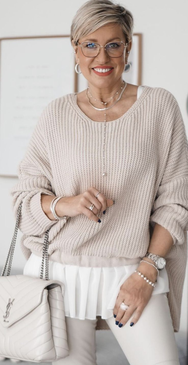Сейчас самым популярным вариантом одежды для женщин 50+ остаются свитера и кардиганы. Для осеннего сезона рекомендуется выбирать свитера в нейтральных тонах: сером, кремовом, темно-синим. Однако не стоит бояться экспериментов с яркими оттенками! Особое внимание стоит уделить моделям с интересными способами вязки, которые добавят образу индивидуальности.