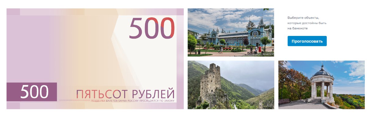 На обновленной купюре будут размещены достопримечательности Пятигорска. Каждому участнику голосования предстоит выбрать два символа: один для лицевой стороны банкноты – из достопримечательностей Пятигорска; один для оборотной – из объектов регионов Северо-Кавказского федерального округа.