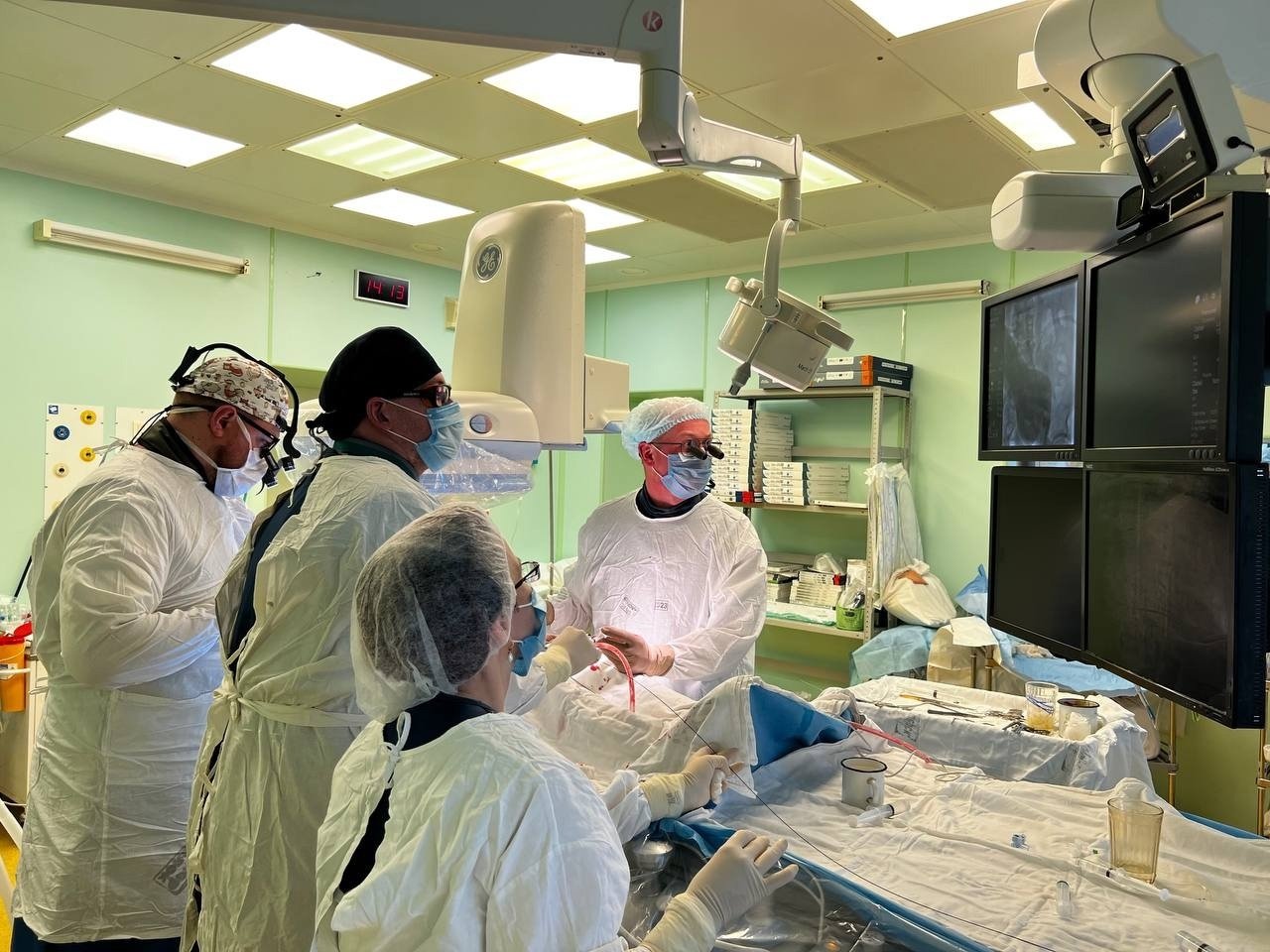 – Проблема заключалась в том, что если бы мы делали вмешательство только малоинвазивно, то пришлось бы устанавливать новые стенты поверх старых, что повлияло бы на дальнейшую проходимость сосуда. Наша задача была убрать свежие тромбы из стентов, но сначала ликвидировать бляшку, которая и была причиной тромбоза. Поэтому мы решили сделать гибридную операцию совместно с сердечно-сосудистыми хирургами, – рассказал врач по рентгенэндоваскулярным диагностике и лечению АОКБ Антон Костенков.