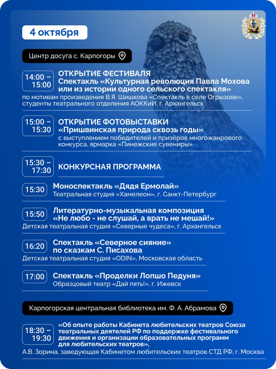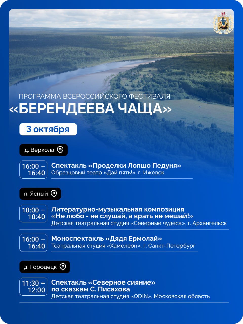 Если вы хотели, но откладывали поездку в Пинежский округ, то сейчас – самое время!С 3 по 5 октября здесь пройдет всероссийский театральный фестиваль «Берендеева чаща»