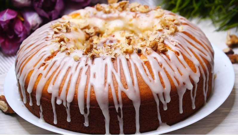 Чтобы завершить пирог, приготовьте лимонную глазурь. В миске соедините сахарную пудру с лимонным соком и тщательно перемешайте до однородной консистенции. Готовую глазурь нанесите на остывший пирог, и voil?! Пирог «Вулкан» готов, пора угощать близких.