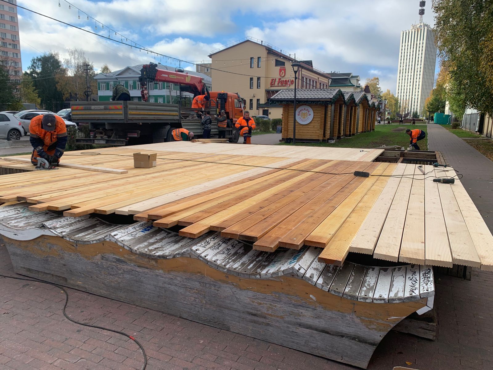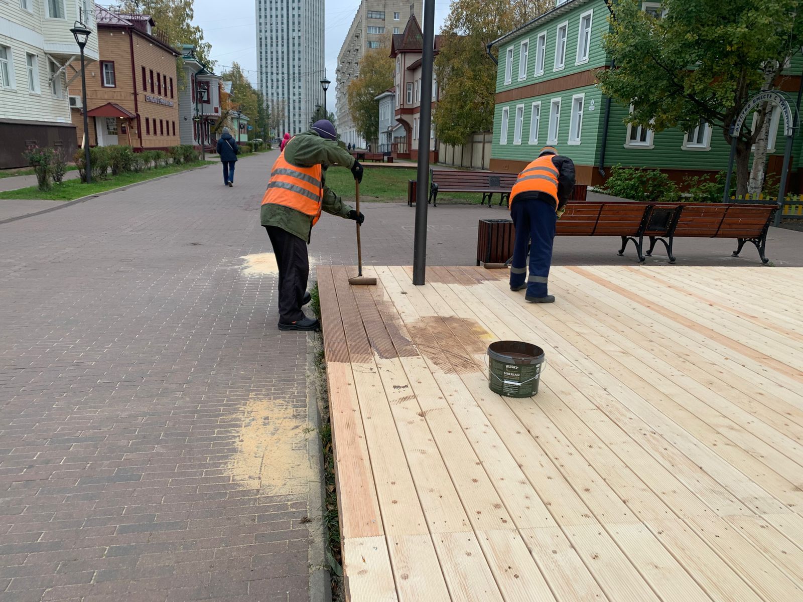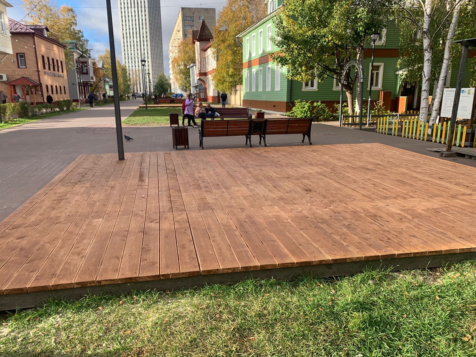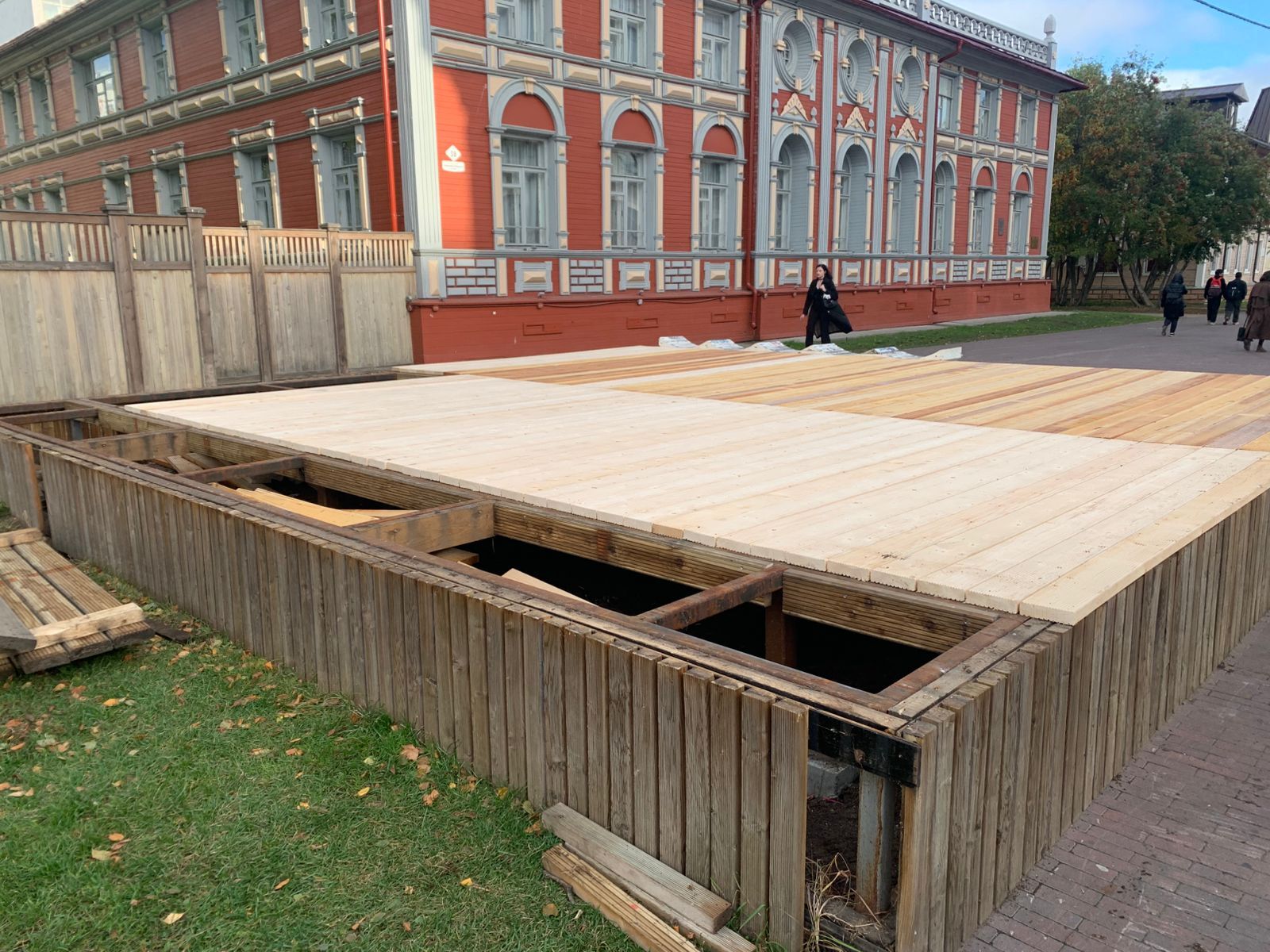 Открывающиеся деревянные покрытия приобрели темно - коричневый оттенок, который соответствует общему стилю проспекта. Специалистами предприятия «Городское благоустройство» установлено на данный момент 4 конструкции, в ближайшей перспективе - еще 2.