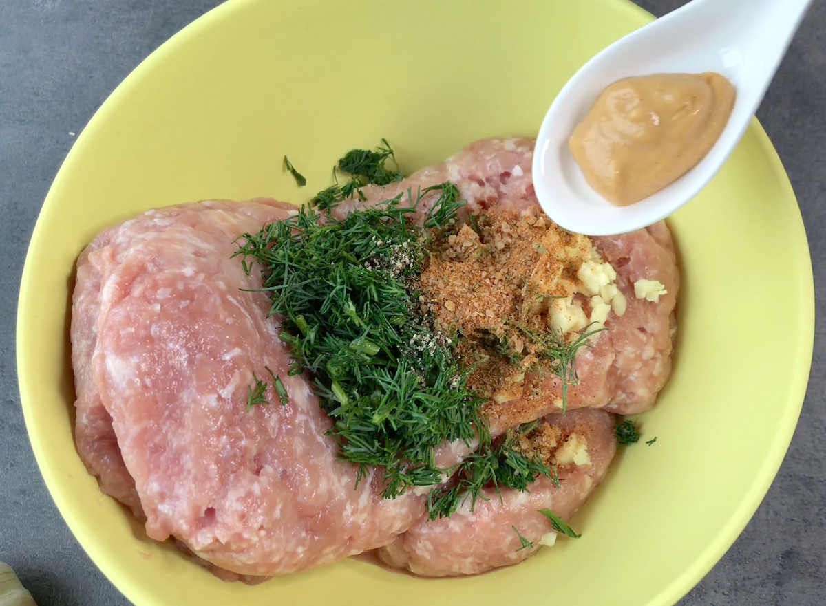 Шаг 1: Начните с того, что выложите мясной фарш в большую миску. Добавьте к нему нарезанный укроп, соль, перец, чеснок и горчицу. Как следует перемешайте все ингредиенты до однородной массы.
