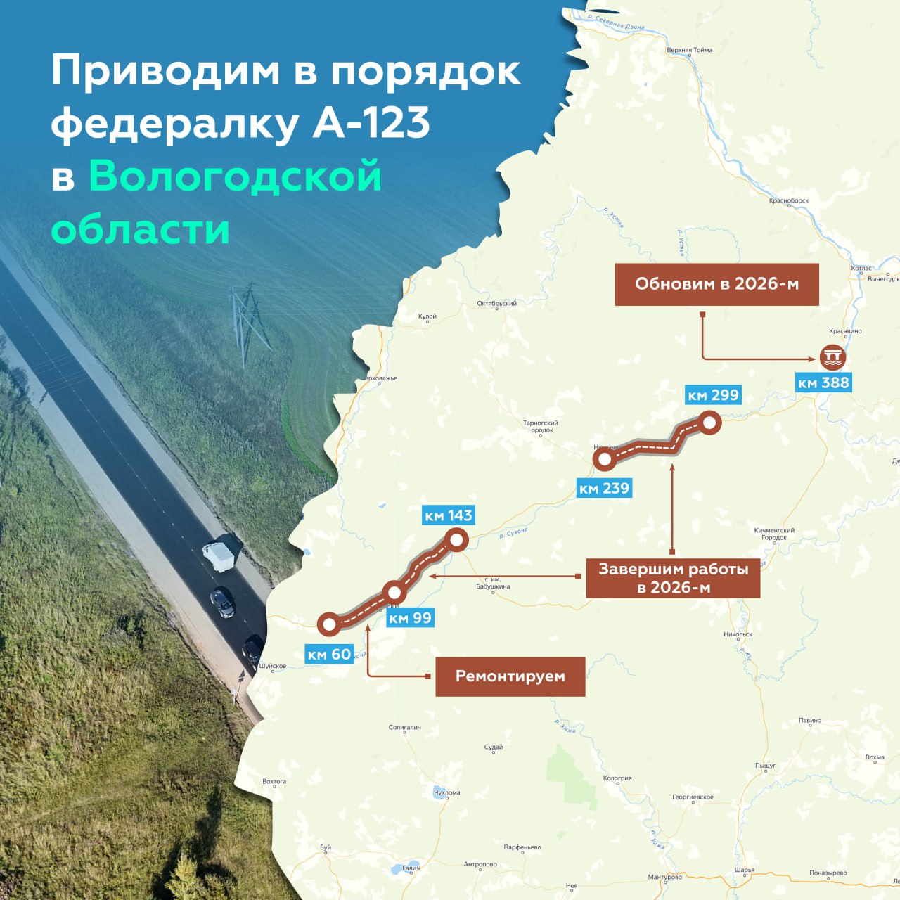 Федералка А-123 проходит по Вологодской и Архангельской областям, а также Республике Коми. Её длина — 665 км.