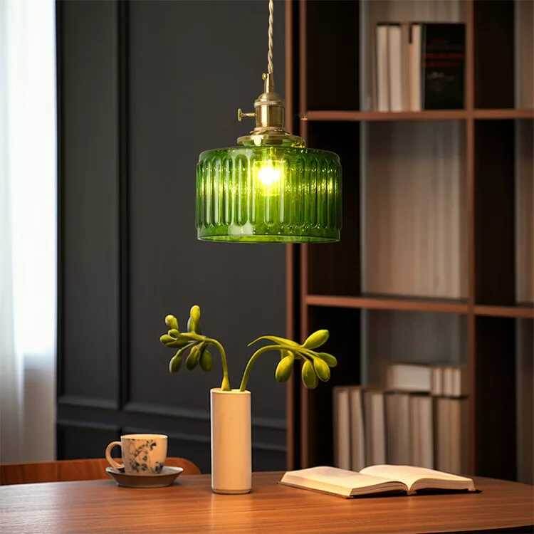 Подвесной светильник в виде ребристого купола — еще один отличный вариант. Этот элемент декора прекрасно подчеркнет вашу приверженность к ретро-стилю. Такие светильники появились в послевоенные годы и по-прежнему выглядят стильно. Идеально подходят для кухни-гостиной или обеденной зоны, создавая уютную атмосферу во время совместных ужинов.