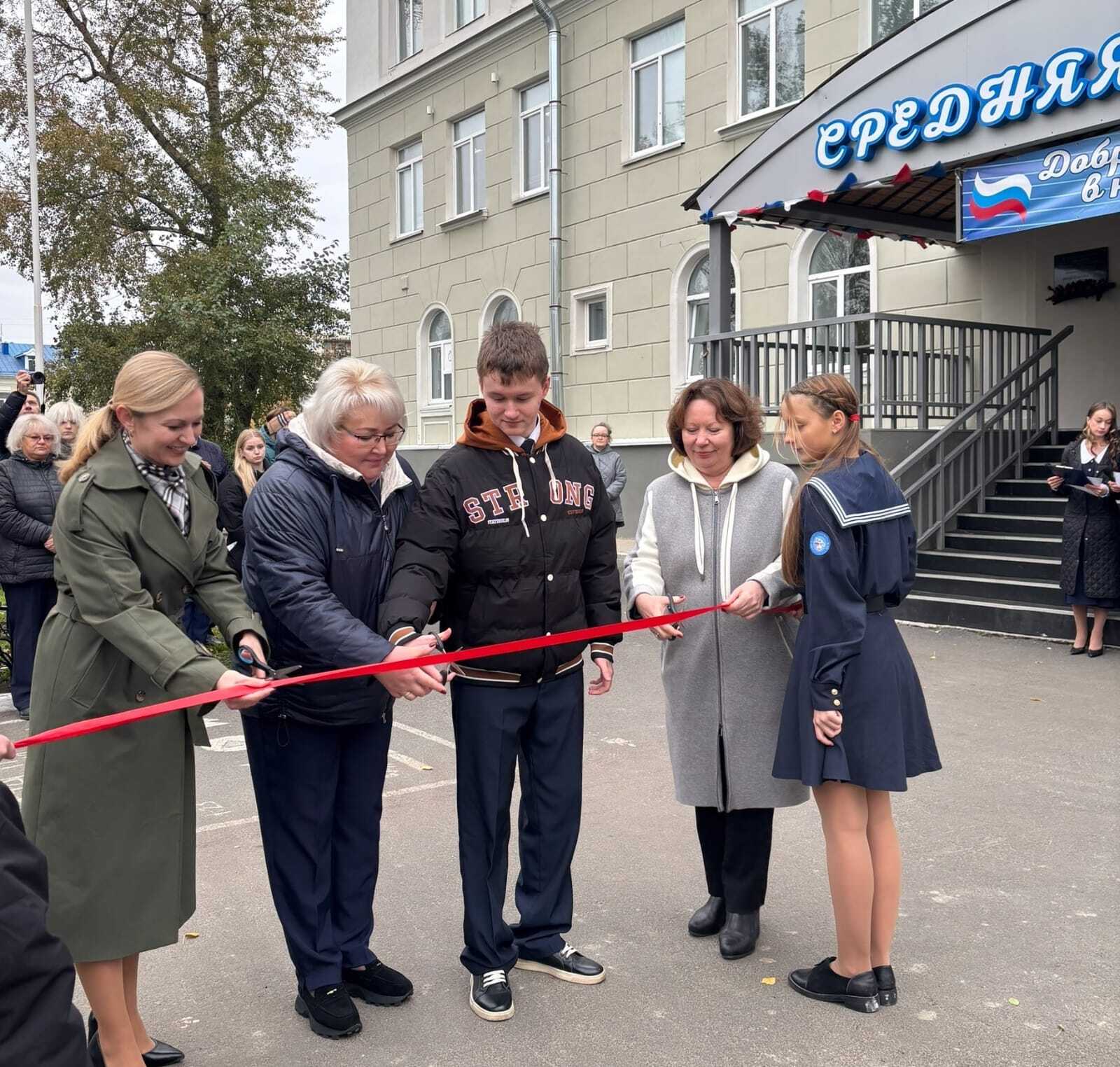 За летнее время с фасадной части школы был благоустроен участок, на котором появились брусчатые дорожки, скамейки, елка в центре композиции и стенд памяти Константина Симонова, чье имя носит школа.