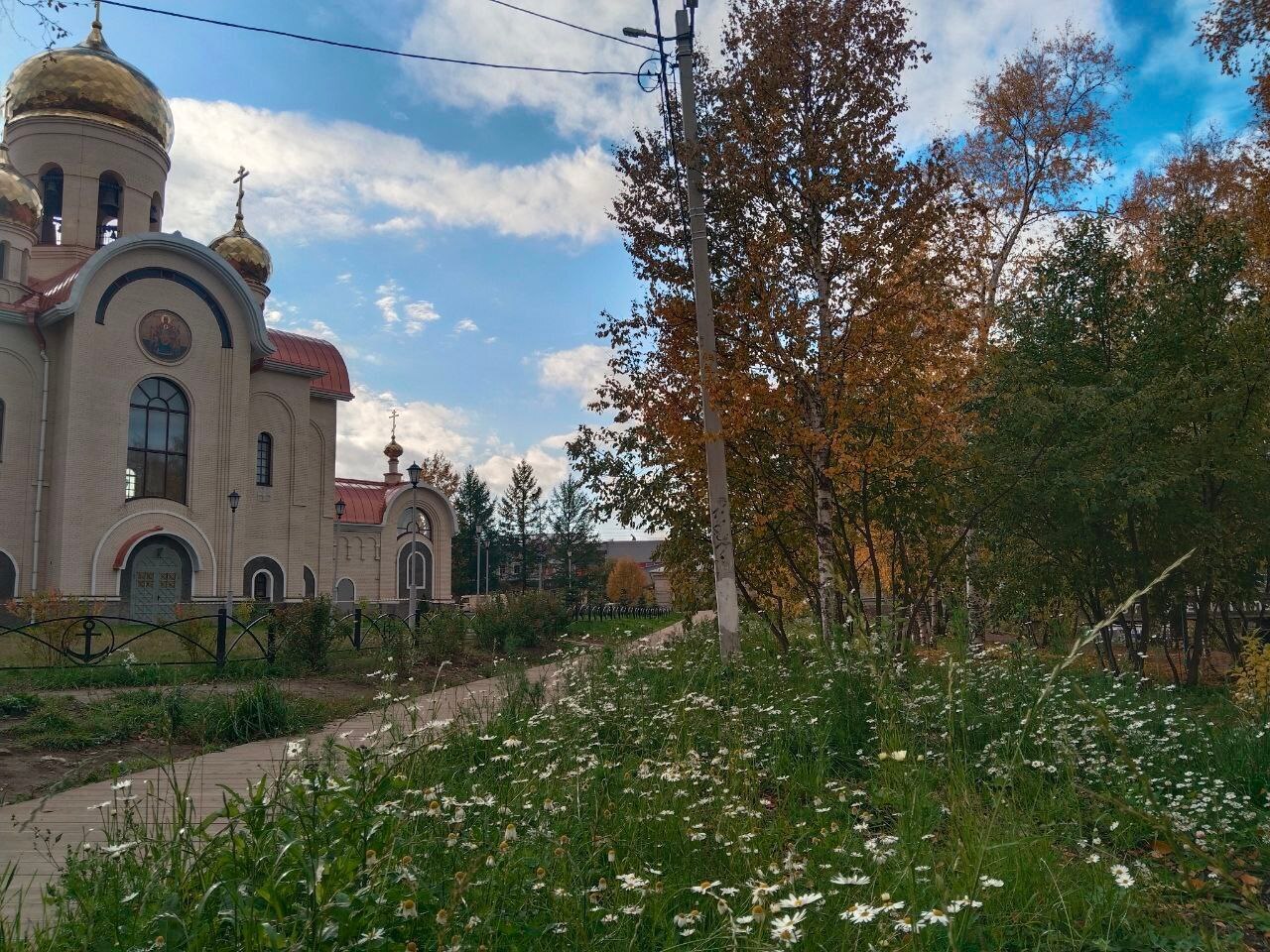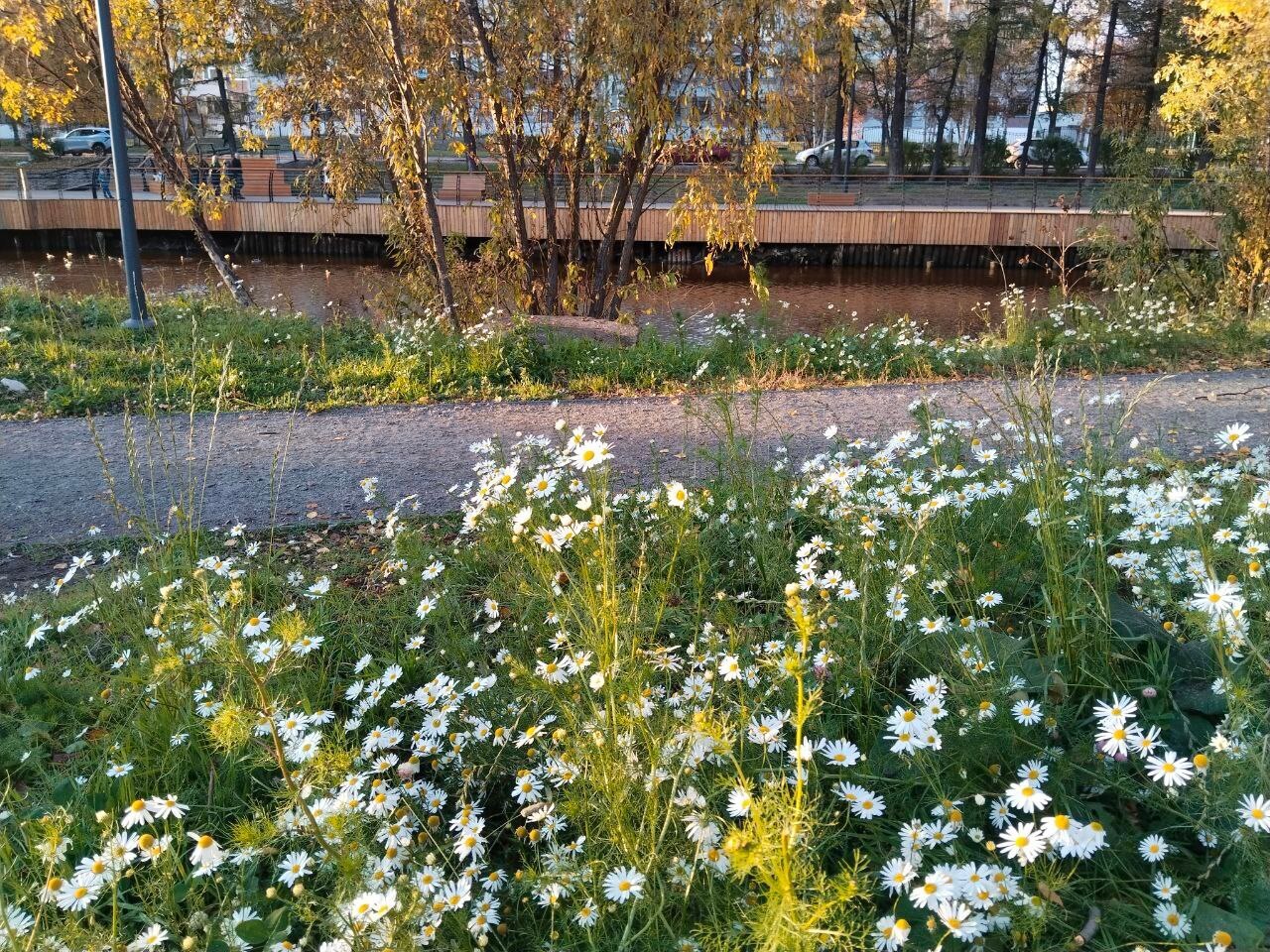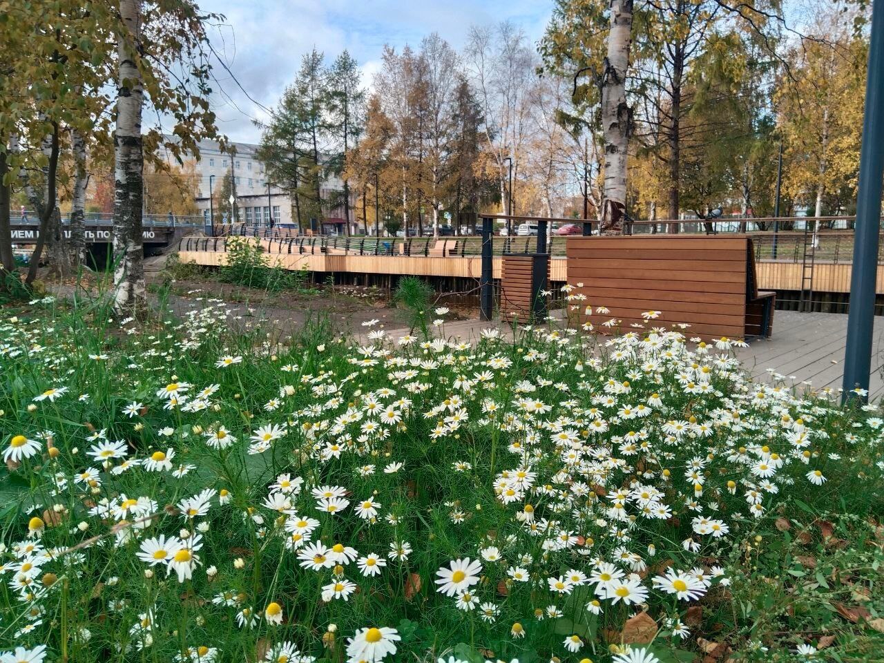 Осень на набережной Соломбалки — время желтых листьев и ярких ромашек