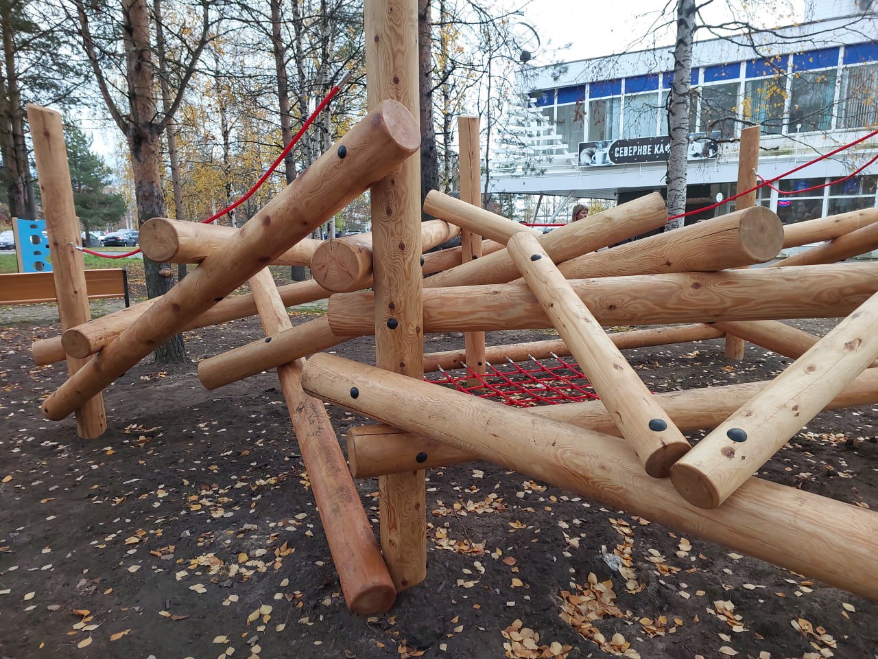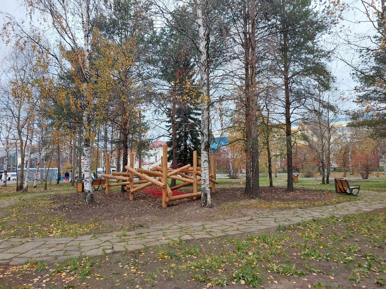В сквере «Добро» установили необычные игровые элементы: они выполнены из лиственницы с пропиткой. Это ступеньки, балансиры и площадка «Бурелом». Рядом есть и скамейки для семейного отдыха. Всё это – среди крупных деревьев разных пород и с видом на реку.