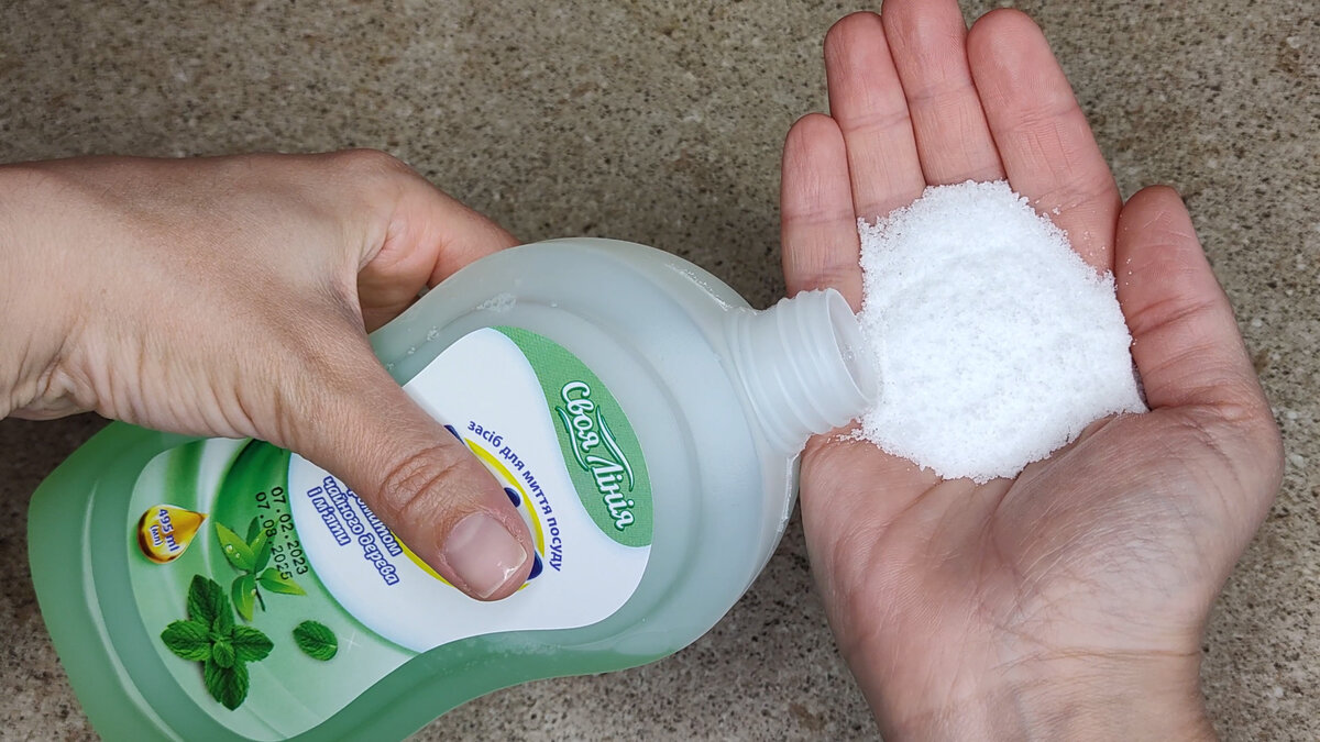 Сначала в миске смешивают моющее средство и теплую воду. Затем добавляют соль и соду, тщательно перемешивая все ингредиенты до однородной консистенции. Полученный чистящий раствор можно перелить в контейнер с удобным дозатором.