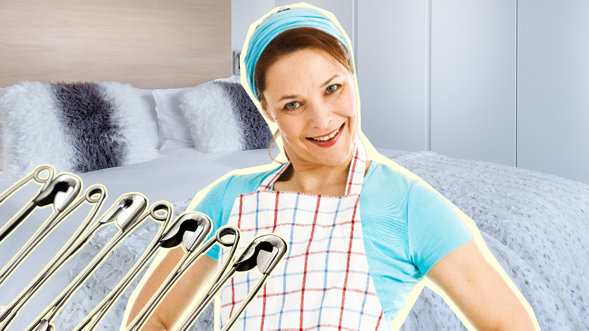 Эта хитрость известна с давних времен. Ее используют те, у кого простыни без липучек или резинки. Если закрепить углы булавками снизу, то постельное белье не будет комкаться или сползать.