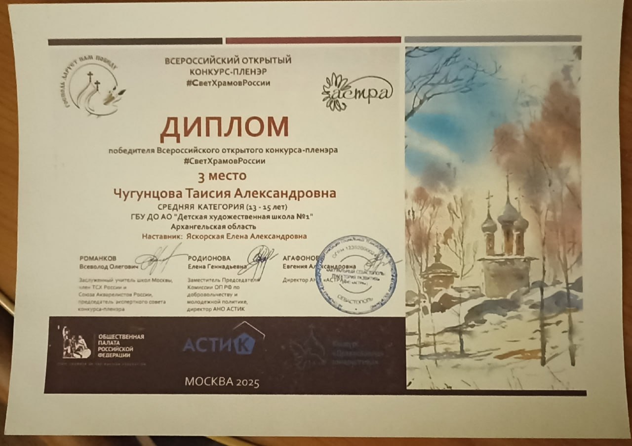 Учащаяся Детской художественной школы № 1 Таисия Чугунцова вошла в число финалистов-победителей Всероссийского открытого конкурса-пленэра «Свет Храмов России».