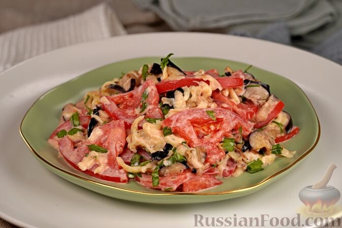 - Салат с баклажанами, помидорами и сыром — простое решение для сытного обеда.
