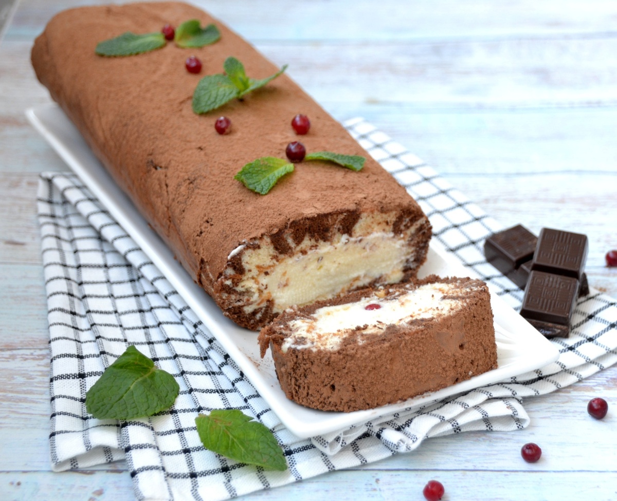 Рулет оборачивается пленкой и помещается в холодильник на несколько часов, после чего можно срезать кромки и посыпать какао-порошком перед подачей на стол.