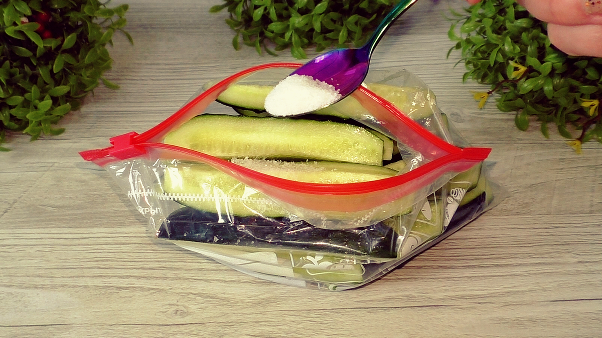 Этапы приготовления:1. Огурцы тщательно промыть и нарезать на четвертинки.2. Упаковать в прочный пакет, добавив все специи и соль.3. Уплотнить содержимое пакета и оставить на 30 минут.