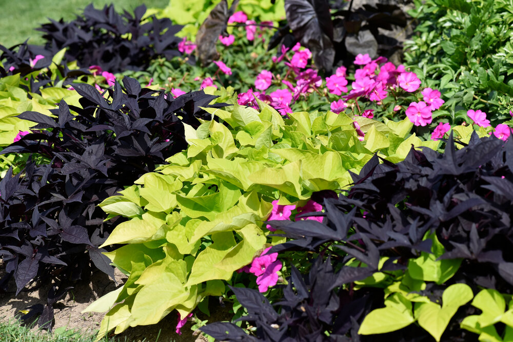 Происходящая из тропиков Индии, ипомея батат (Ipomoea batatas) характеризуется декоративными листами различных оттенков – от зеленого до пурпурного. Эта лиана предпочитает солнечные места и хорошо дренированные, влажные почвы. Порадует садоводов и разнообразием сортов, среди которых особое внимание коже на себя серийные выходцы, такие как Sweet Caroline, с их компактным ростом и эффектной листвой.