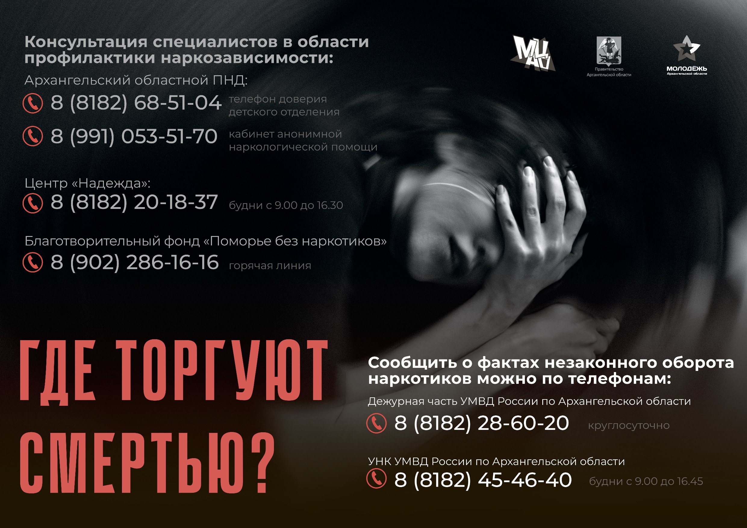 Региональный общественный благотворительный центр «Поморье без наркотиков», телефон горячей линии 8 (8182) 47-16-16.