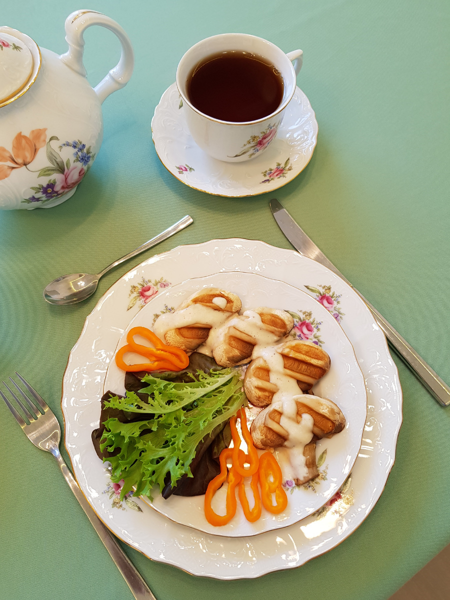 Готовые грибы следует выложить на красивую тарелку, предварительно украсив её листьями свежего салата. Полить горячим соусом 'Субиз', чтобы добавить пикантности к блюду. Кроме того, можно дополнить все это ломтиками сладкого десертного перца для более яркого визуального оформления и разнообразия вкусов.