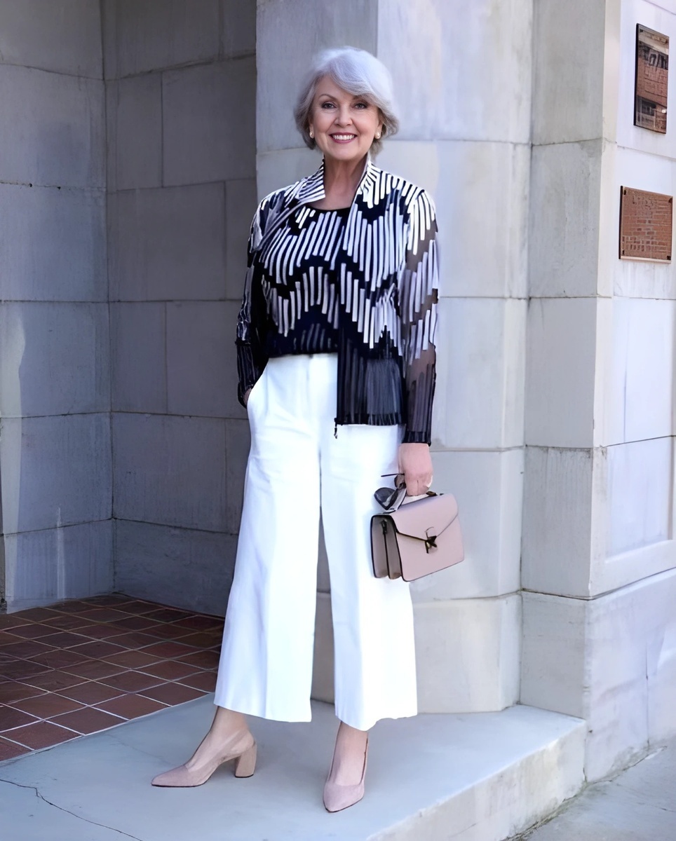 1. Широкие брюки и стильный верх: Нельзя игнорировать шикарные белоснежные брюки до щиколоток, которые прекрасно гармонируют с темным верхом. Черно-серо-белая блузка, заправленная за пояс, аккуратно акцентирует талию, а легкая полупрозрачная рубашка скрывает возрастные особенности шеи и рук.