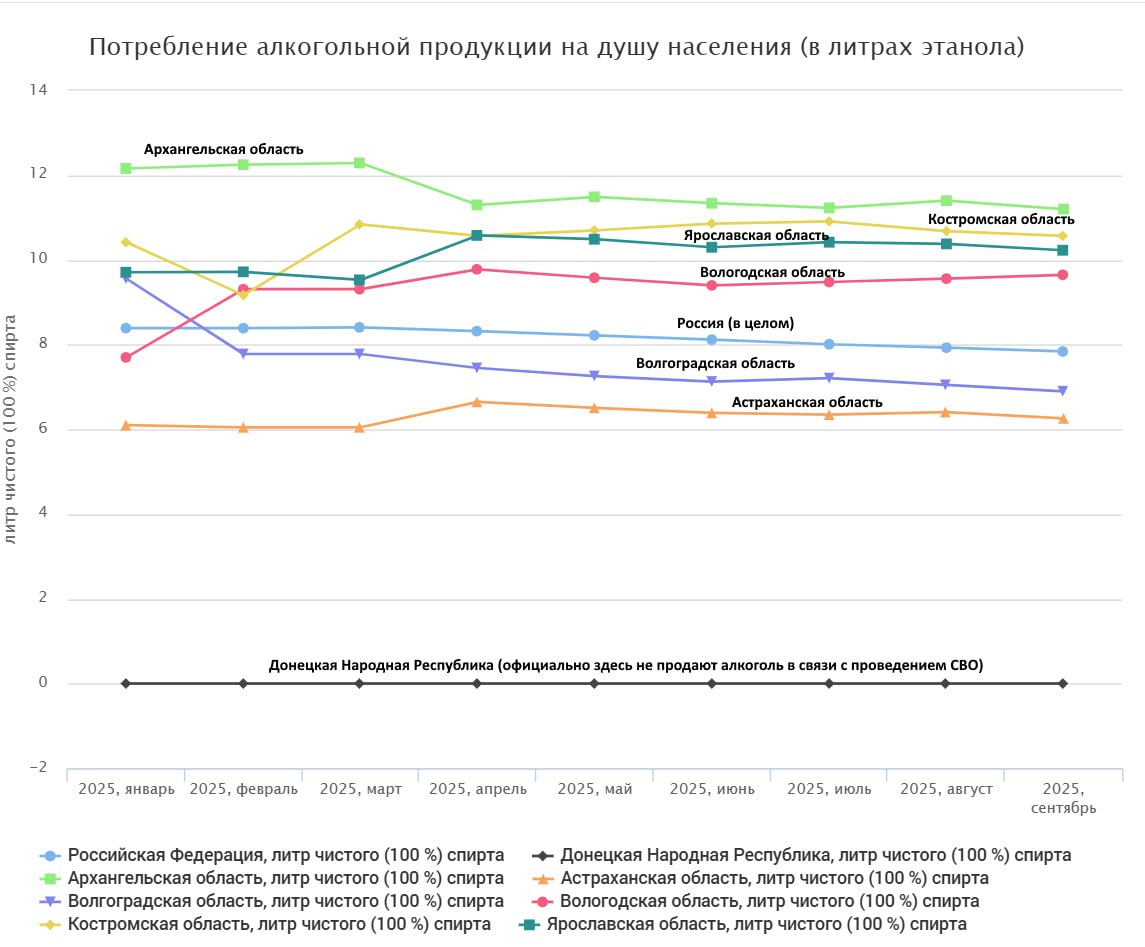 ДНР, где официально торговать алкоголем запрещено (что не равно обнулению его потребления) в связи с СВО, я взял, чтобы отбить на графике «ноль» и чтобы нагляднее выглядела картинка.