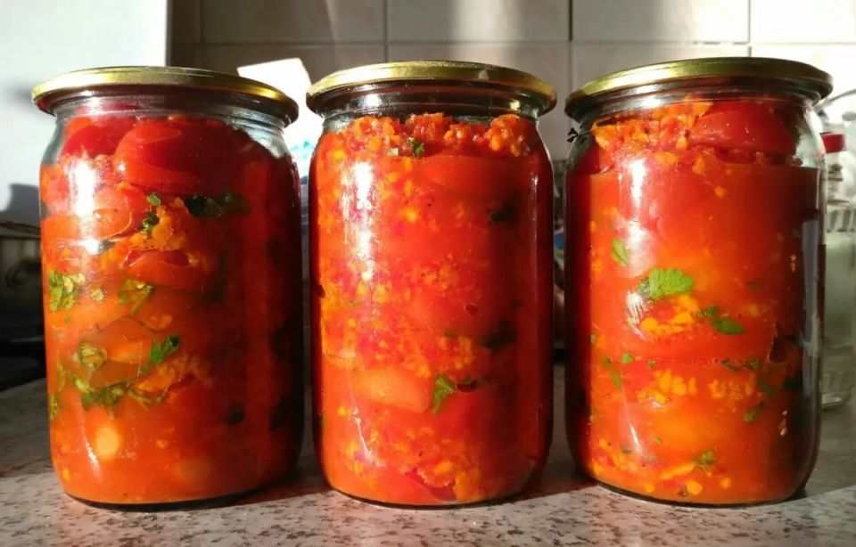 Теперь нужно приступить к укладке в банки. Слоями распределить помидоры и пюре из перца с чесноком, добавляя зелень. Не забудьте насыпать паприку в каждую банку, а затем влить уксус и растительное масло.
