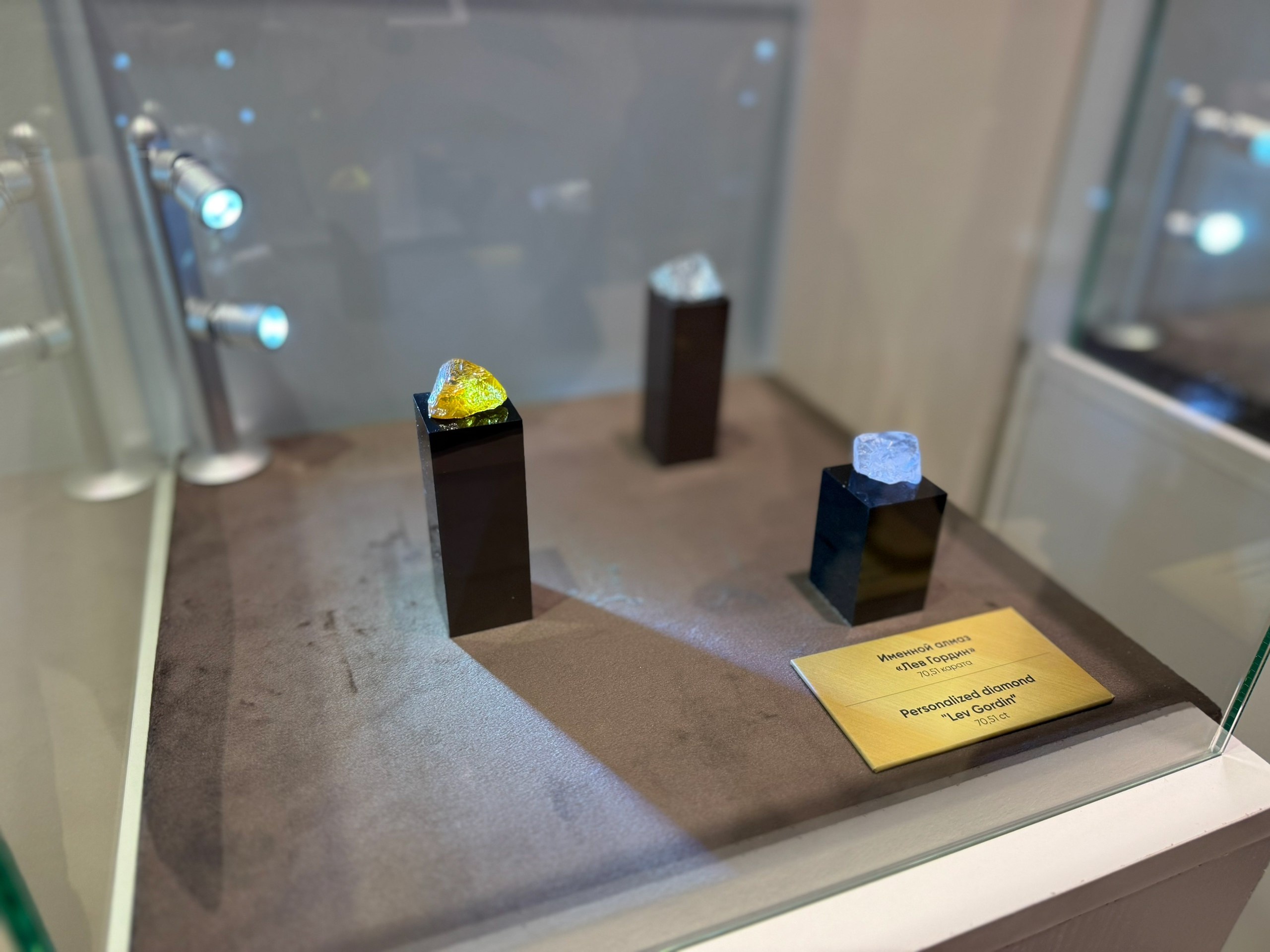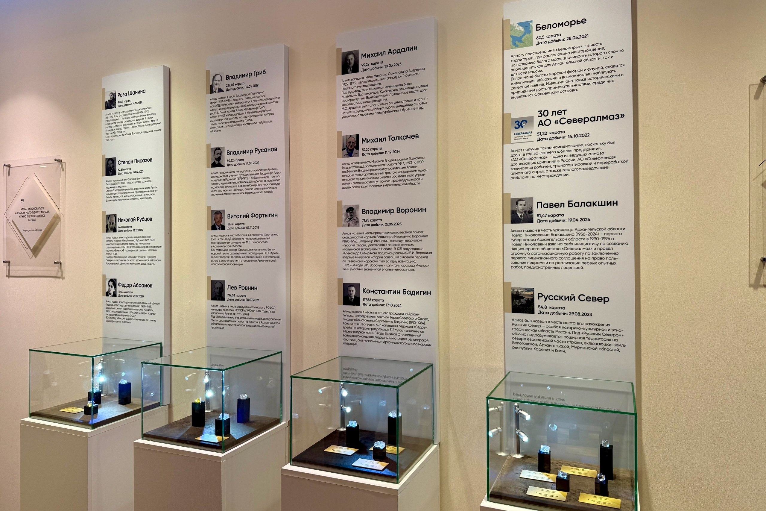 В экспозиции представлены более 300 экспонатов: алмазы, минералы-спутники и копии именных камней, уникальные документы, фото- и видеоматериалы, раритеты из архива геологов, макет месторождения, инструменты ювелира, бриллианты
