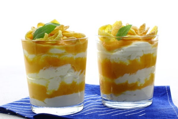 Что касается текстуры, привычные кукурузные хлопья могут быть заменены хрустящим попкорном. Данный десерт особенно эффектно смотрится в высоких стаканах, что придаёт ему нарядный вид.