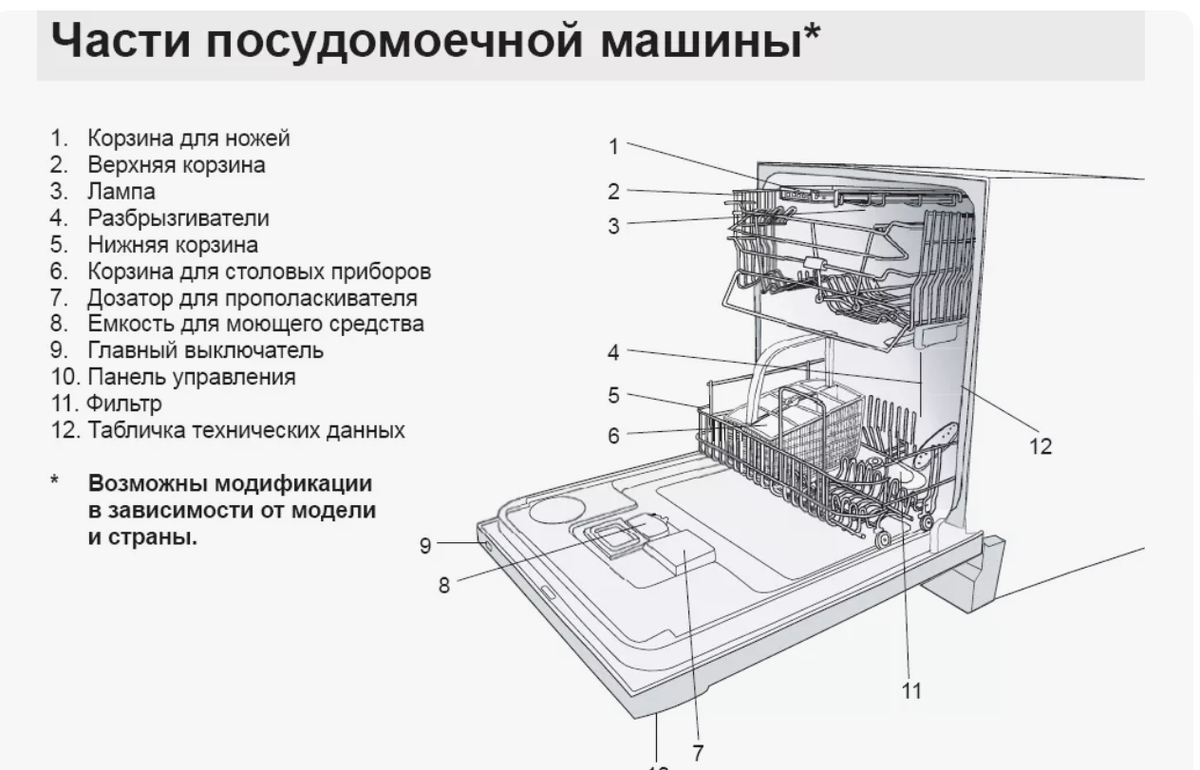 Посудомоечная машина включает множество ключевых частей, которые обеспечивают ее бесперебойную работу: