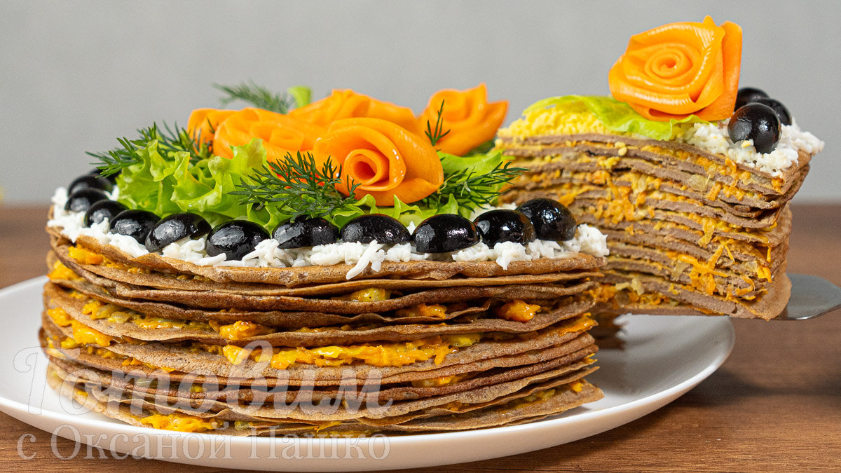 Сборка торта начинается с первого блина, который смазывается начинкой. Далее повторять процесс с каждым блином и не забывать о завершающем слое: майонезом. Для украшения подойдет тертый белок и желток, размещенные по краю, а также цветочная композиция из моркови и оливок, которые добавят визуальной привлекательности.