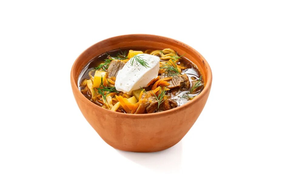 8. За 3 минуты до завершения готовки добавляют лапшу. Перед подачей на стол, суп солят по вкусу и насыщают сметаной.
