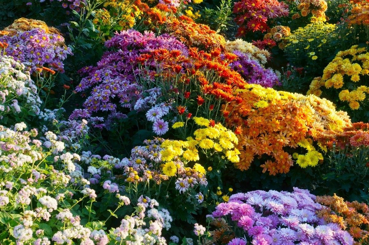 - Хризантемы: Эти "королевы осени" обильно цветут с момента сентября, а палитра их оттенков впечатляет разнообразием. Они легко приживаются и украшают сад до первых холодов.