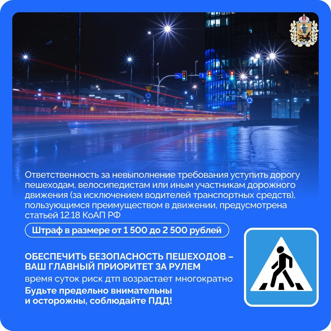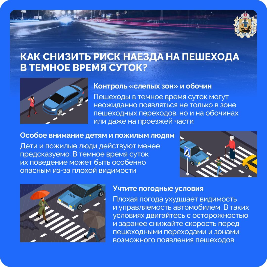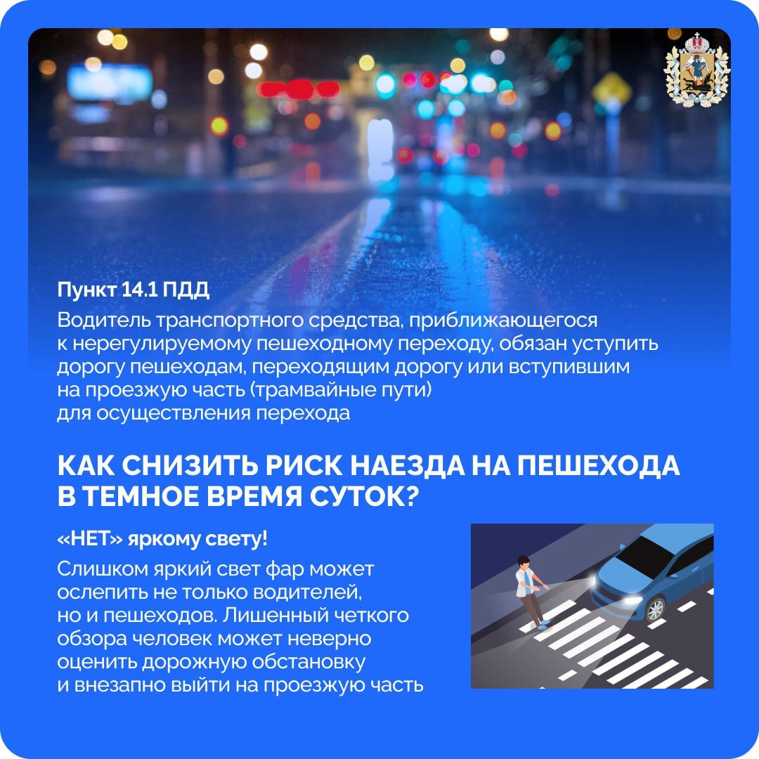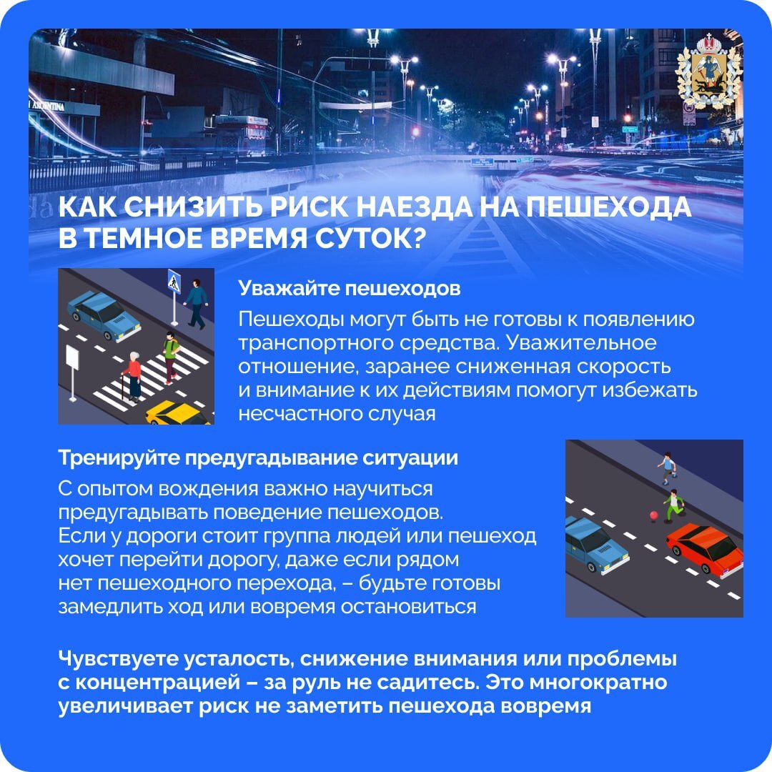 С наступлением темноты видимость на дорогах ухудшается, и водителям важно быть особенно внимательными. Для вашей безопасности и безопасности окружающих снижайте скорость перед пешеходными переходами и на участках дороги с повышенным риском.