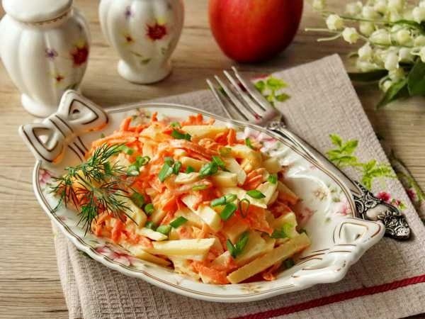 Чтобы приготовить салат, начните с тщательной очистки и мытья моркови. Затем натрите её на крупной терке. Яблоко также требует подготовки: его стоит вымыть, очистить от кожуры и нарезать тонкими ломтиками или соломкой. После этого смешайте яблоки с натертой морковью.