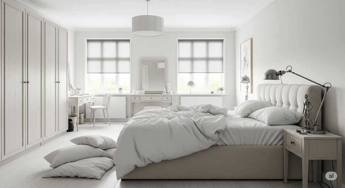 Спальня: Яркий или холодный свет, наряду с отсутствием текстиля, создаёт атмосферу дискомфорта. Чтобы сделать спальню более уютной, стоит выбрать лампы тёплого спектра, добавить текстильные элементы, такие как мягкое постельное белье и пледы, а также установить шторы, чтобы смягчить пространство.