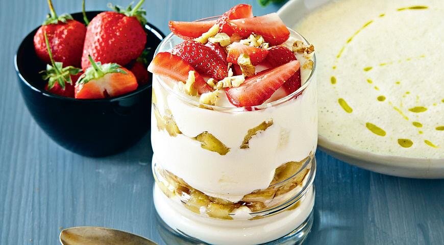 Шаг 2: В стаканы или небольшие креманки налейте 2 столовые ложки натурального йогурта. На этот слой добавьте половину карамелизованных бананов, затем снова йогурт и оставшиеся бананы. Завершите слои оставшимся йогуртом, аккуратно выравнивая. Для финального акцента сверху посыпьте десерт измельченными грецкими орехами и украсьте свежими ягодами по своему выбору.