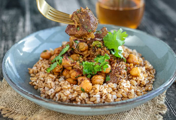 Заранее, за сутки до приготовления, замочите нут в воде, чтобы он хорошо разбух.Отделите баранину от кости и нарежьте её крупными кусками. Мелко порубите бараний жир для дополнительного аромата.В глубоком казане разогрейте оливковое масло вместе с бараний жиром. Обжарьте жир до золотистого цвета и извлеките его.Теперь добавьте целые зубчики чеснока и нарезанные на четверти луковицы. Жарьте до появления золотистой корочки и временно отложите.Обжаривайте мясо до образования румяной корочки, избегая переполнения казана, чтобы не повредить текстуру.После обжаривания соедините мясо с томатами, обжаренными луком и чесноком, замоченным нутом, лавровыми листами и корицей. Залейте всё водой так, чтобы ингредиенты были полностью покрыты.Доведите до кипения, затем уменьшите огонь и накройте крышкой. Тушите около одного часа.Добавьте в блюдо специи, растёртые в ступке. Готовьте до тех пор, пока баранина и нут не станут мягкими. За 15 минут до окончания приготовления добавьте изюм.Перед подачей вмешайте в рагу мелко нарезанную зелень. Подавайте с ароматным гарниром, например, полбой. Блюдо можно украсить свежей кинзой, посыпать сумахом и добавить немного кристаллической соли для акцента.Такой рецепт несомненно станет ярким акцентом на вашем столе, даря всем участникам трапезы наслаждение от богатого вкуса и аромата.