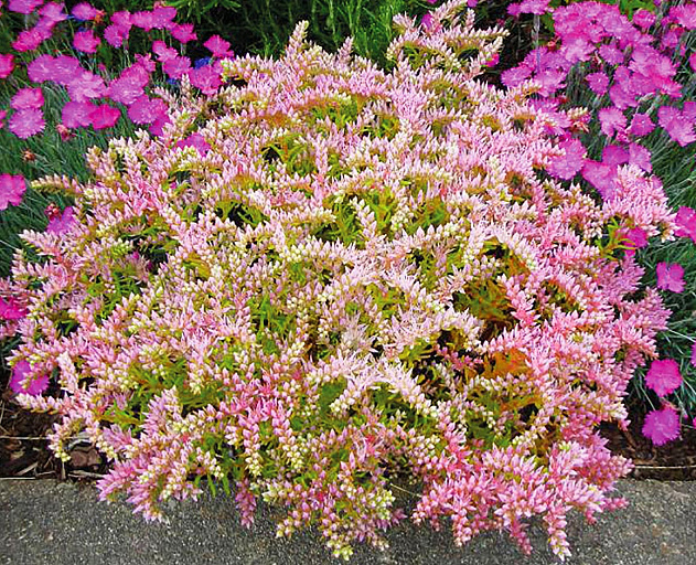 - Очиток Лидийский: Разрастается пышным ковром, радуя глаз яркими звёздчатыми цветами, похожими на кактусовые.