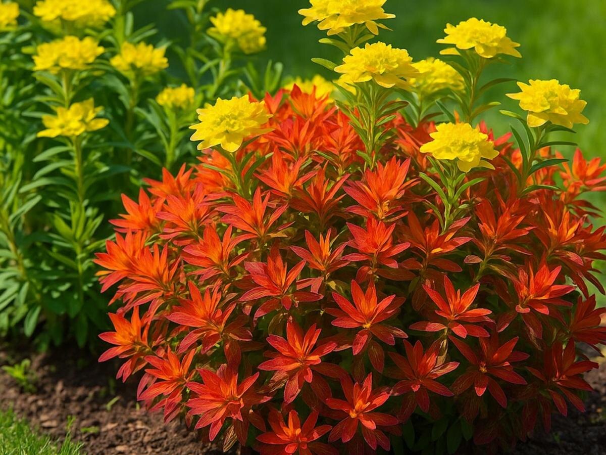 Особое внимание стоит уделить молочаю многоцветковому "Бонфайер" (Euphorbia polychroma). Это растение выделяется своими яркими листьями и соцветиями, а также может служить отличным акцентом в цветнике: