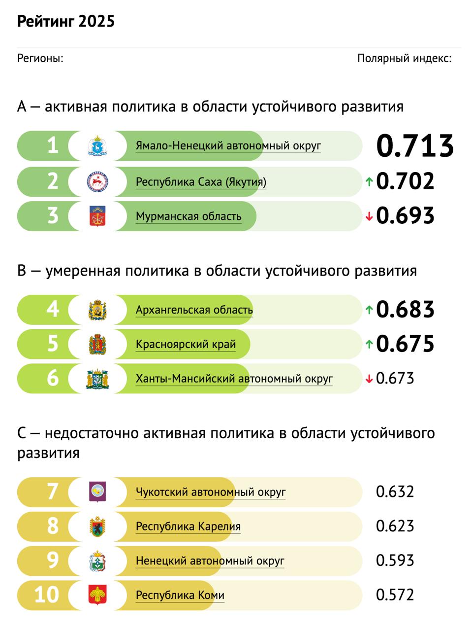 В индекс попадают все регионы Арктической зоны России. Он показывает рейтинг устойчивого развития этих регионов.
