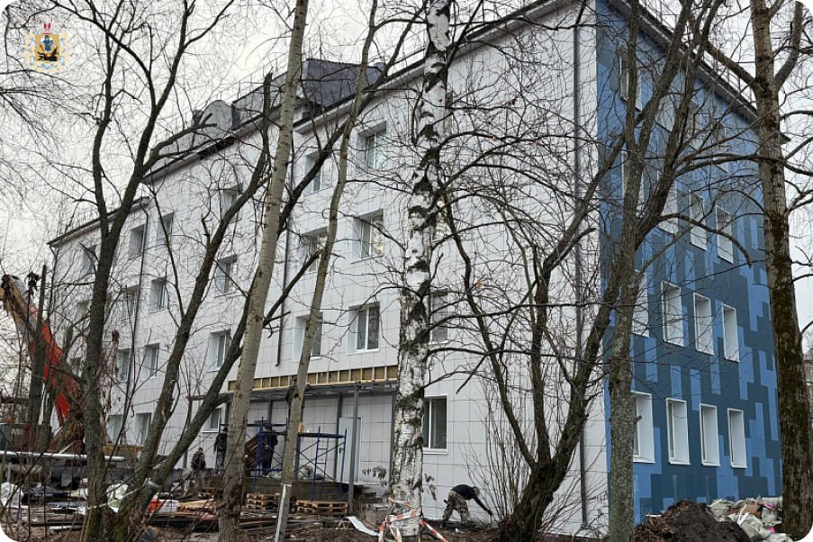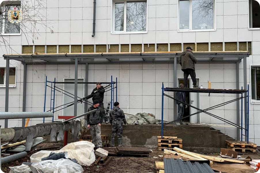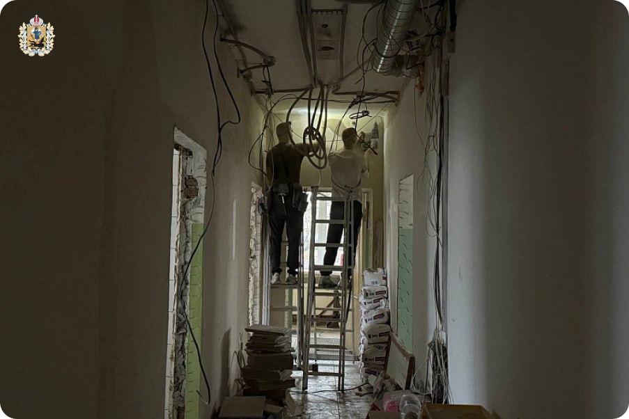Техническая готовность объекта составляет более 80 процентов. Подрядчик проводит отделку помещений, ведет электромонтажные работы по устройству силовых кабельных линий. Продолжаются работы по ремонту кровли, устройству крылец и монтажу вентиляции.