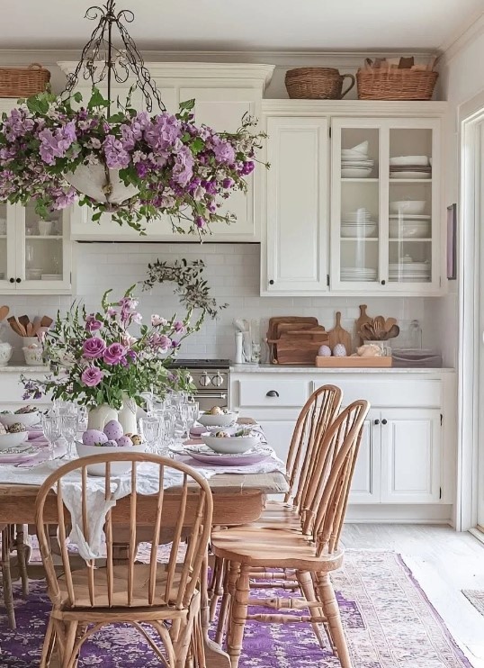 - Яркие акценты: Смелые сочетания цветов и узоров, такие как цветные ковры и текстиль с этническими мотивами, делают кухню живой и яркой.